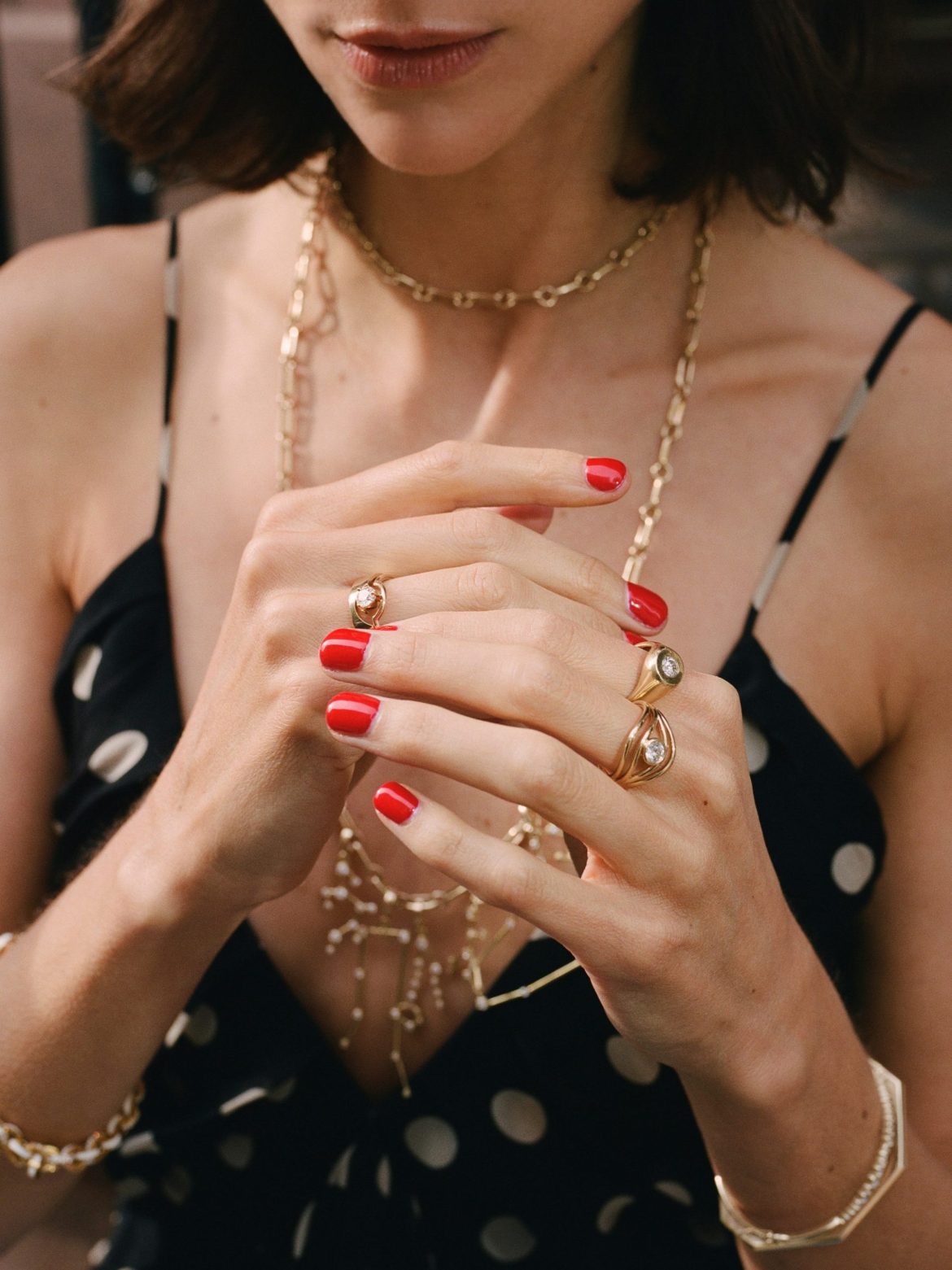 In the spirit of looking at these engagement rings differently, Ten/Ten asked me how I would style them. I headed over to my favorite local jewelry shop in Greenwich Village, the Muse Popup, and piled the pieces on the stunning model Pilar G Solchaga for these photos taken by Sofa Alvarez.
